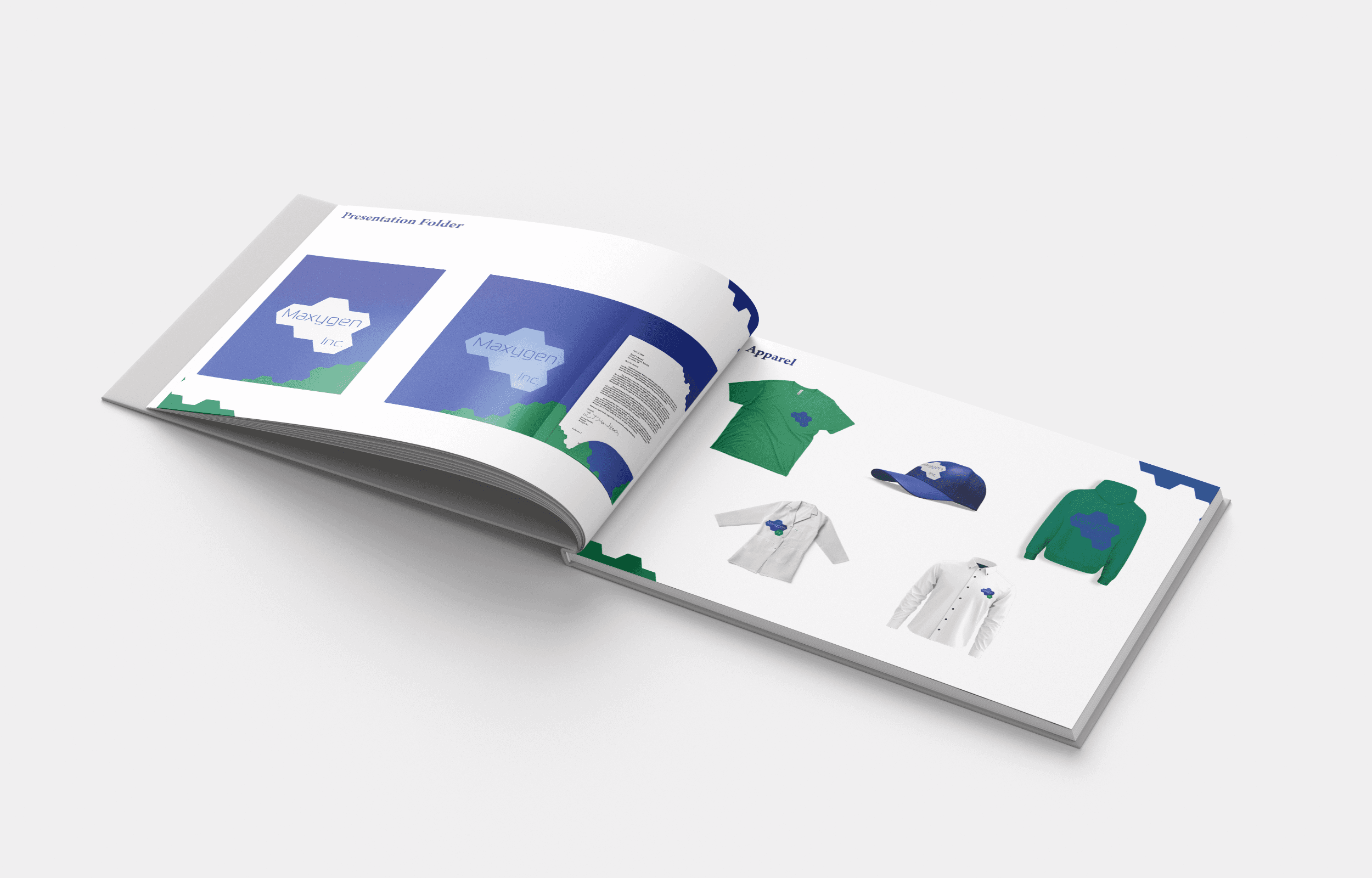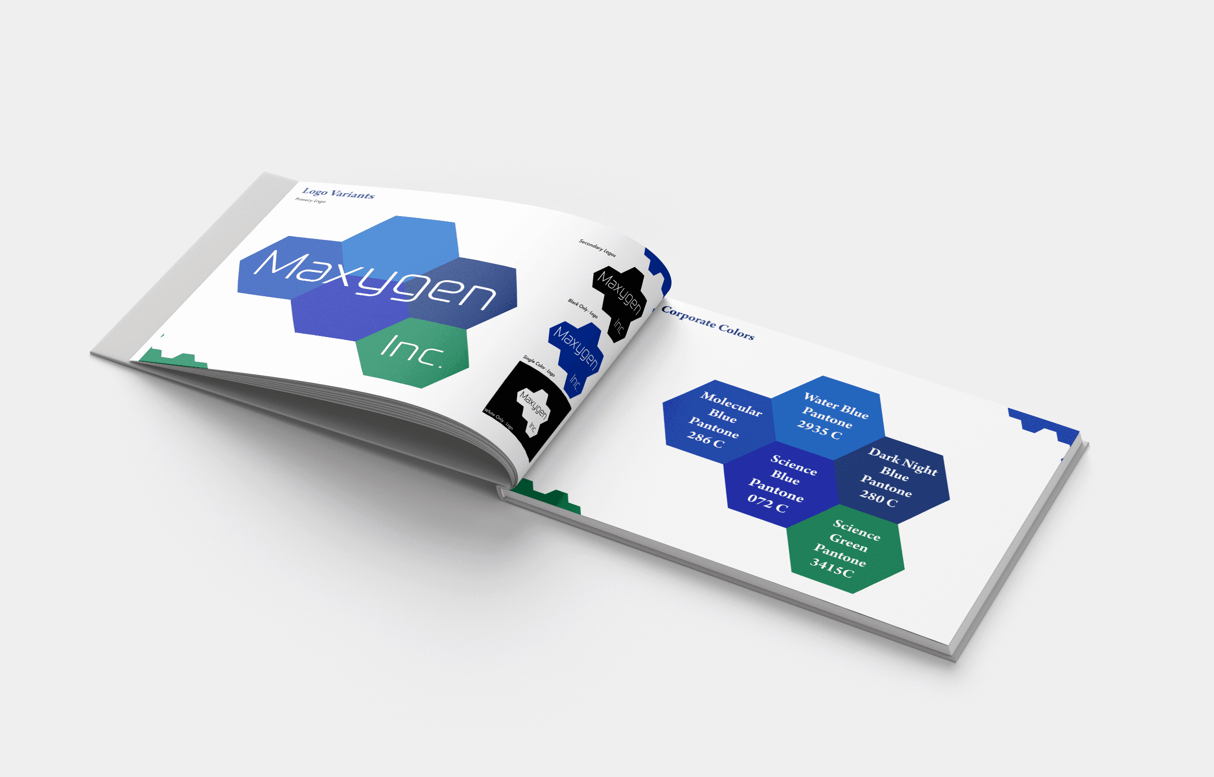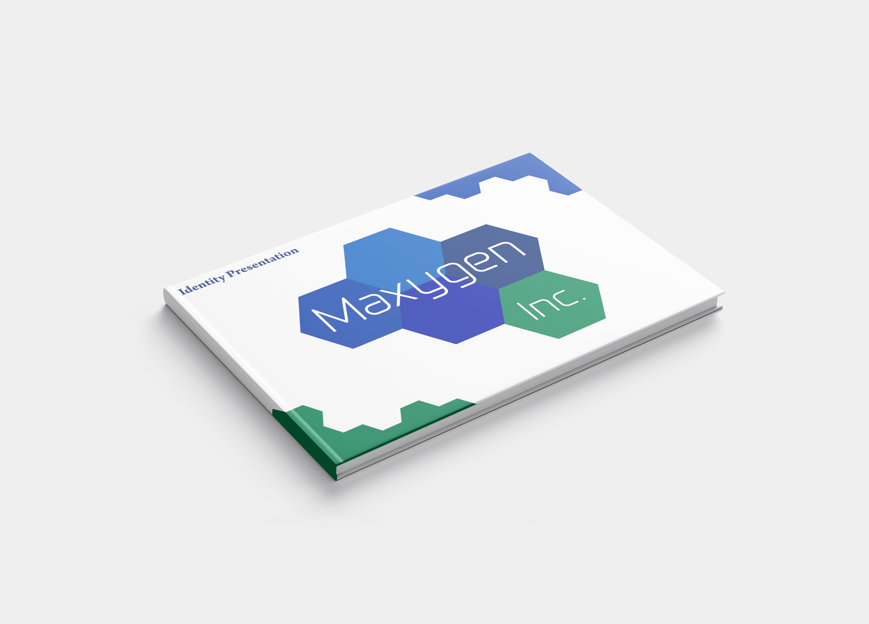 A comprehensive brand identity system and logo specification booklet for Maxygen Inc., a biotechnology company. I designed the complete visual identity including the logo, established a five-color palette of blues and greens reflecting scientific innovation.