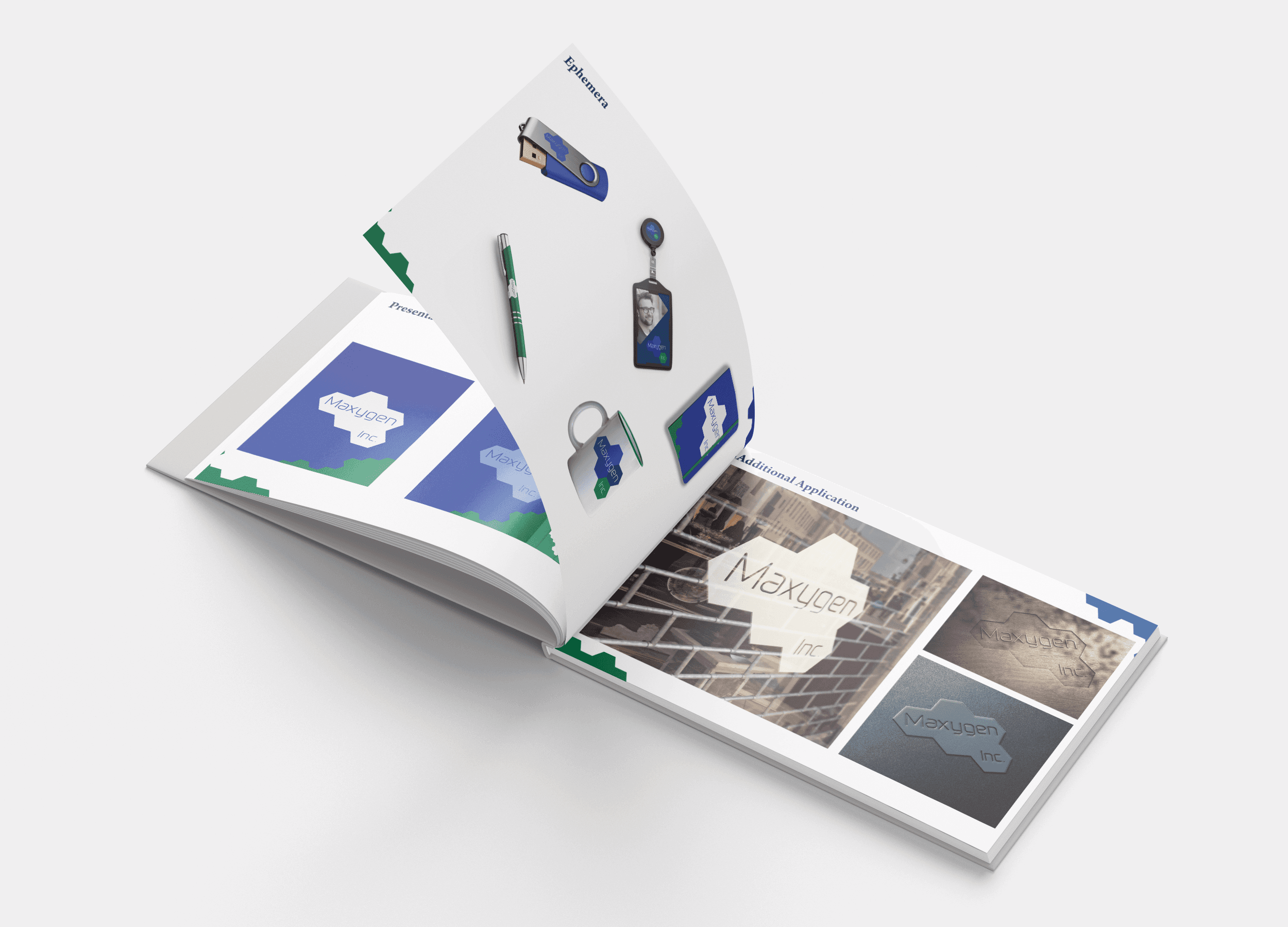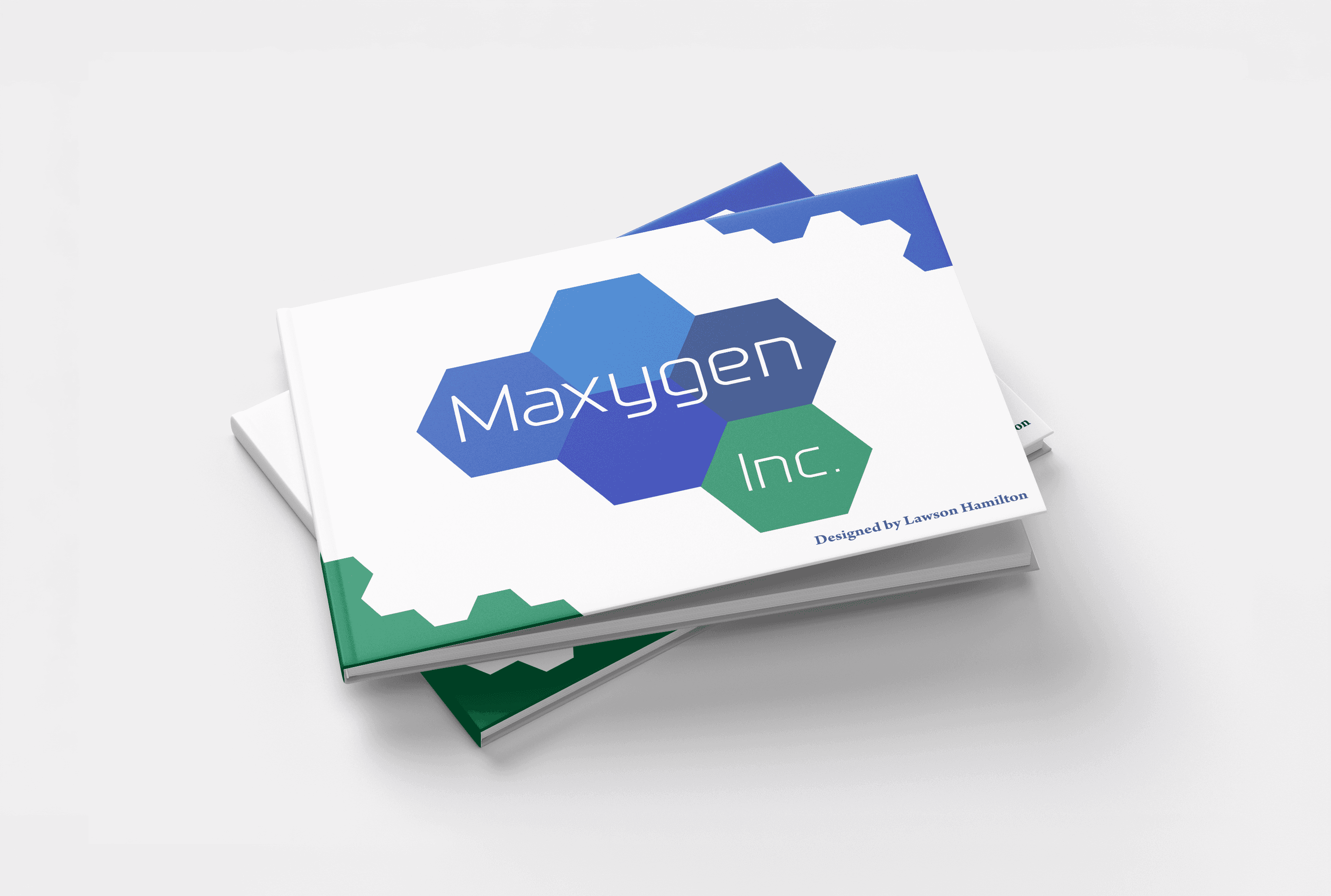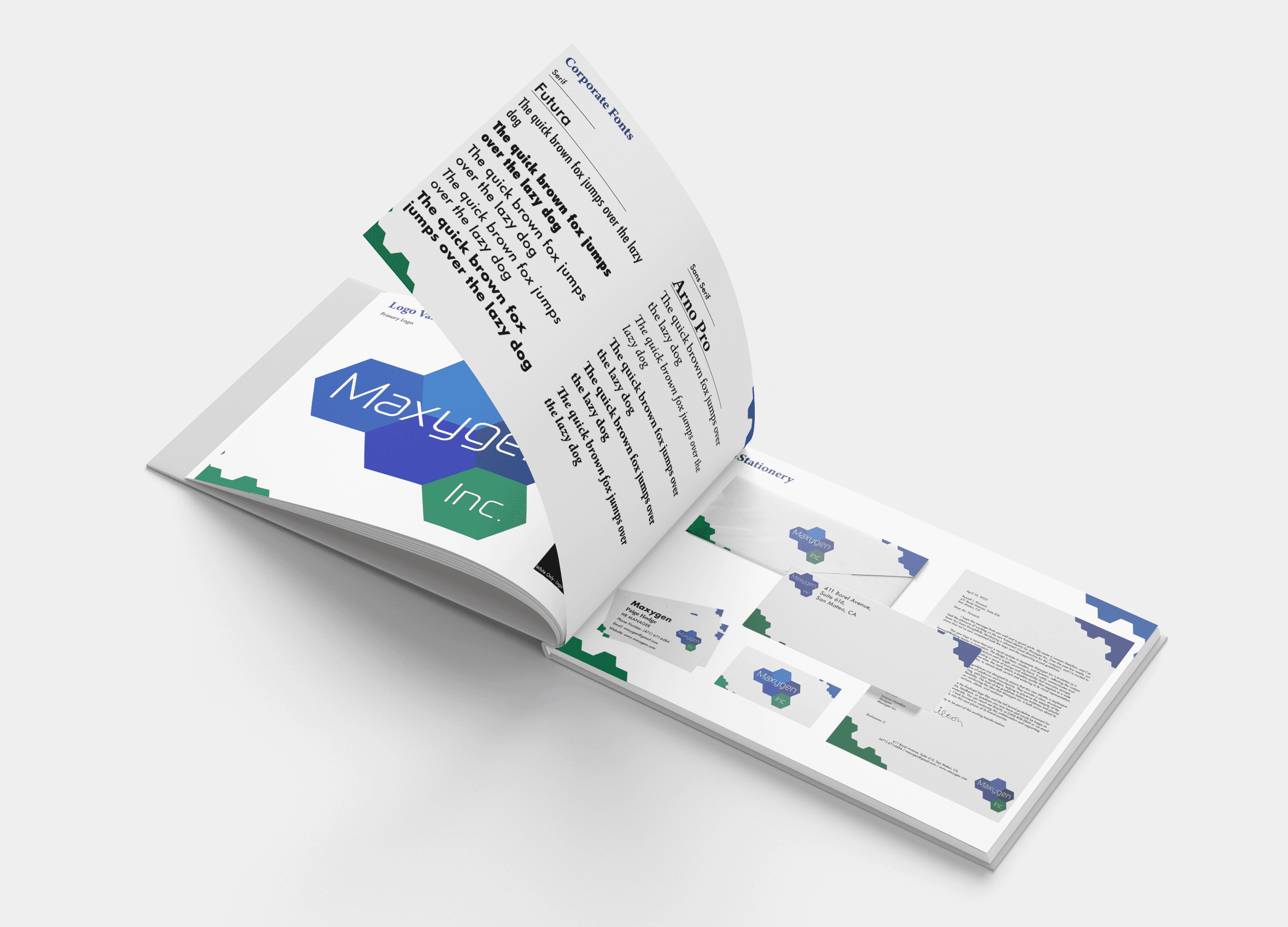 A comprehensive brand identity system and logo specification booklet for Maxygen Inc., a biotechnology company. I designed the complete visual identity including the logo, established a five-color palette of blues and greens reflecting scientific innovation.